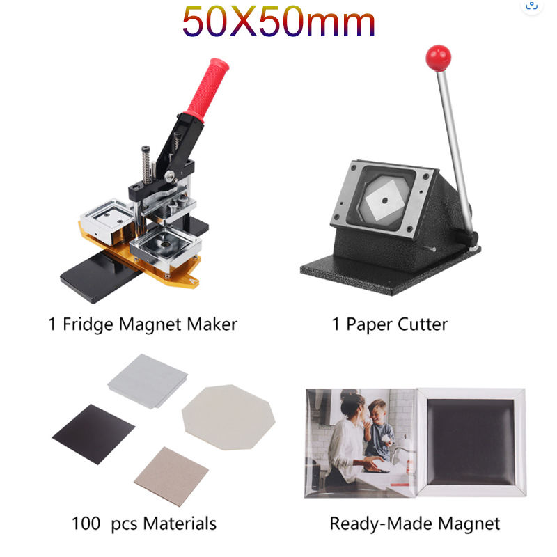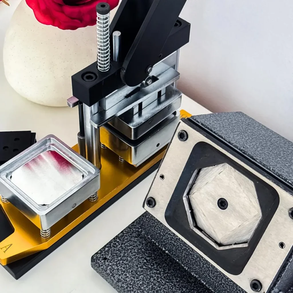 Button stroj (alebo pin press) je zariadenie, ktoré spája kovový podklad, tlačený papier a priehľadný kryt do hotového produktu. Zvládne ho obsluhovať dieťa od cca 8–9 rokov.